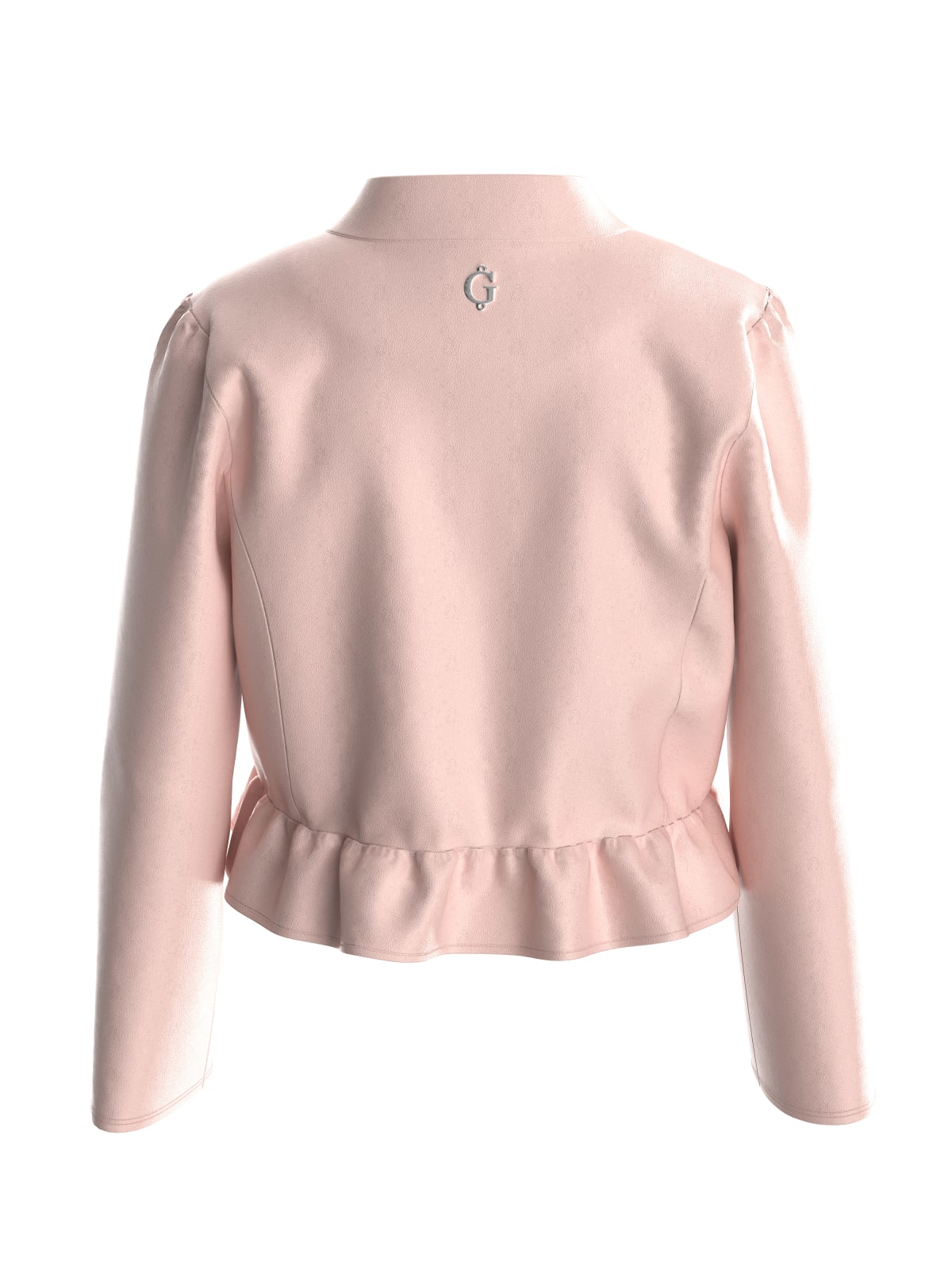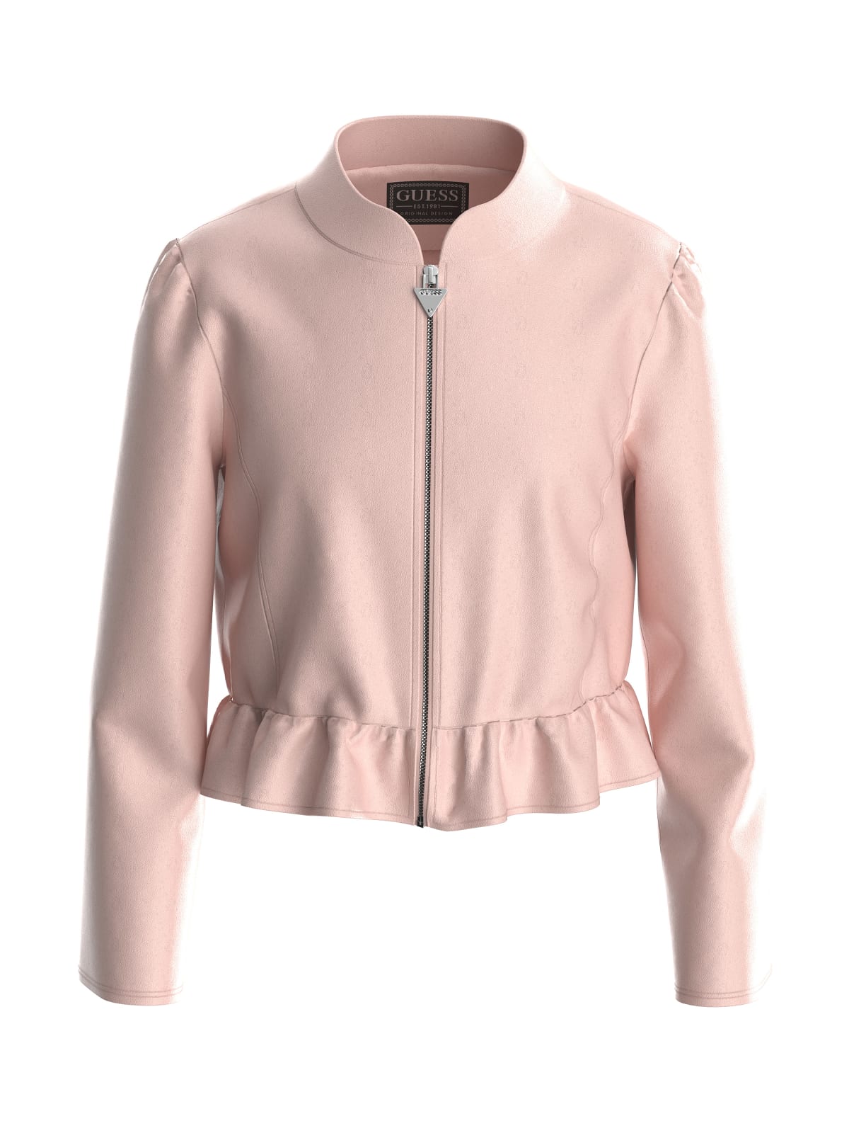 Τζάκετ δερματίνη με ραμμένο ασημί μεταλλικό αρχικό G στον λαιμό στην πίσω όψη, με βολάν στο κάτω μέρος, με όρθιο γιακά, κλείσιμο με ασημί φερμουάρ εμπρός με κρεμαστό μεταλλικό ασημί τρίγωνο με το λογότυπο.