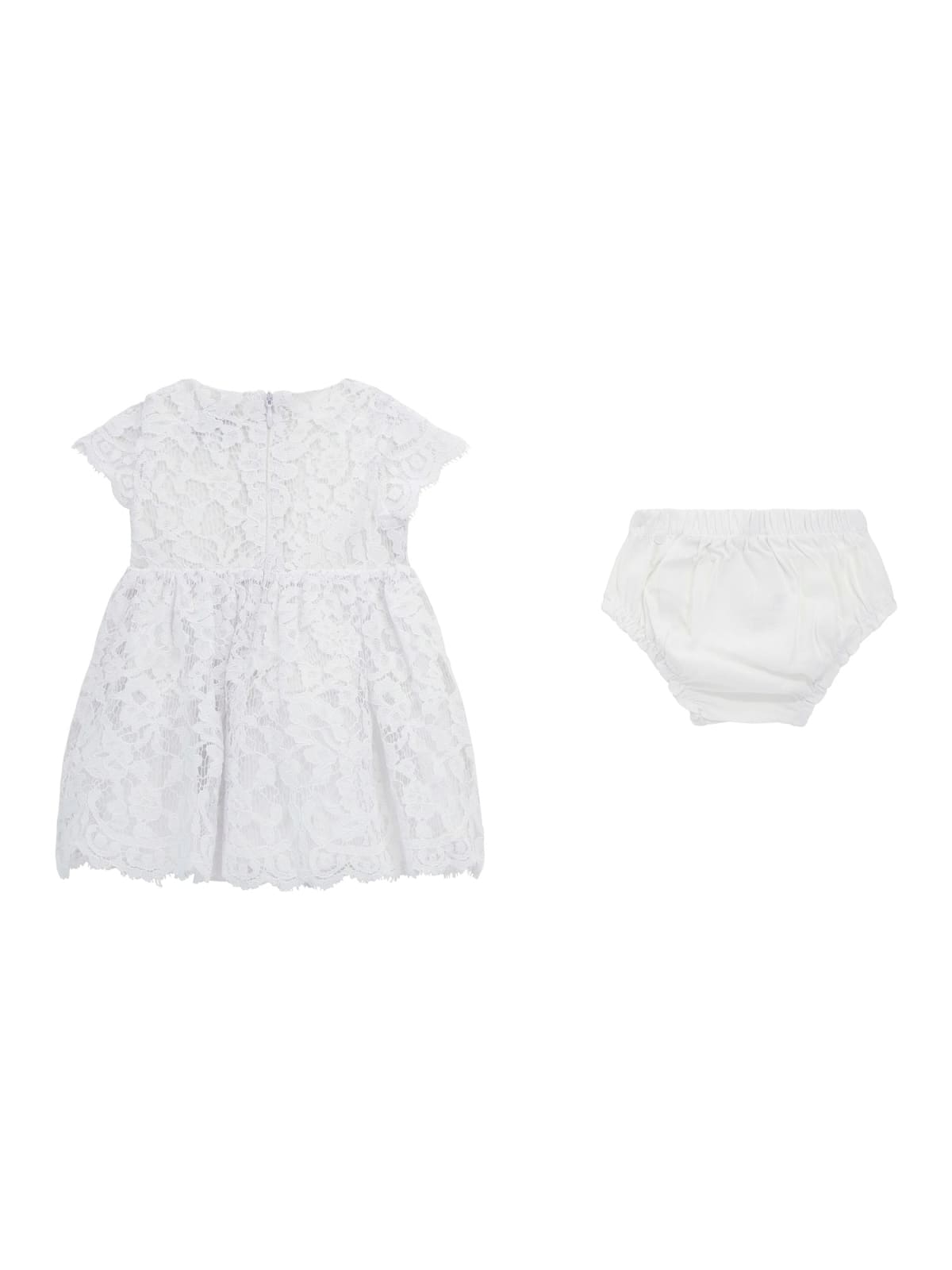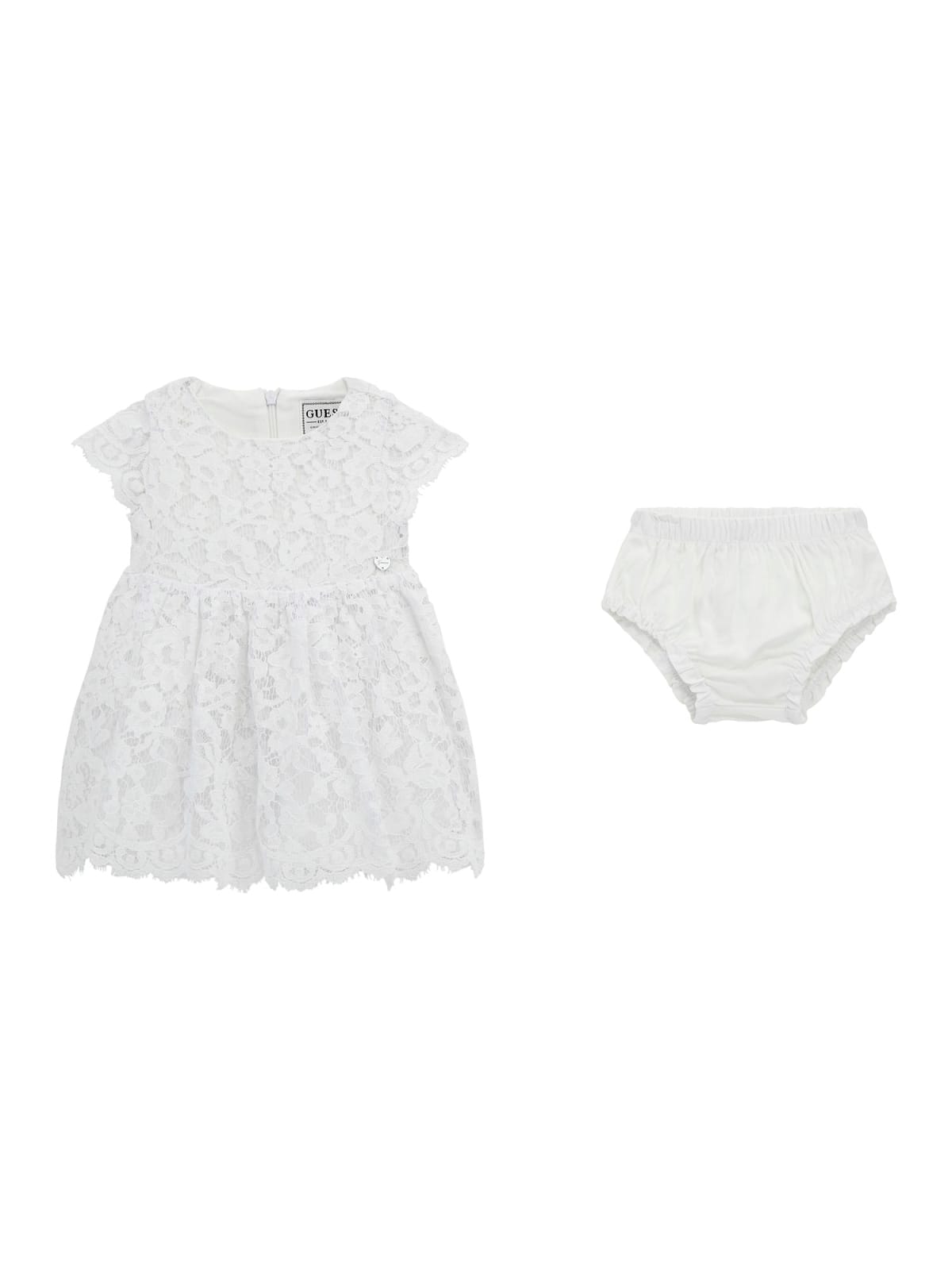 Φόρεμα κοντομάνικο από δαντέλα, με μεταλλική καρδιά με τύπωμα το λογότυπο αριστερά εμπρός, με ύφασμα εσωτερικά και επιπλέον τούλι στο τελείωμα, με δαντέλα εξωτερικά σε όλη την επιφάνεια, με στρογγυλή λαιμόκοψη, κλείσιμο με φερμουάρ πίσω στην πλάτη, και με φουφούλα.