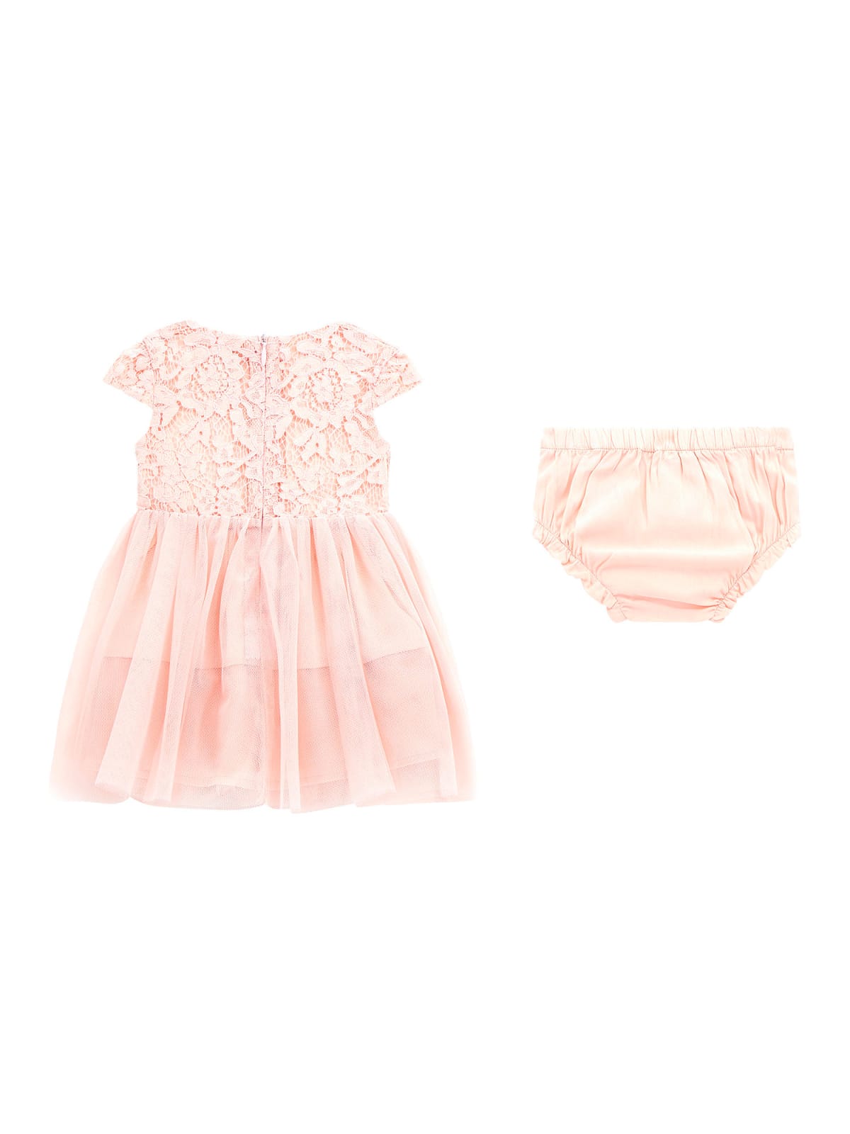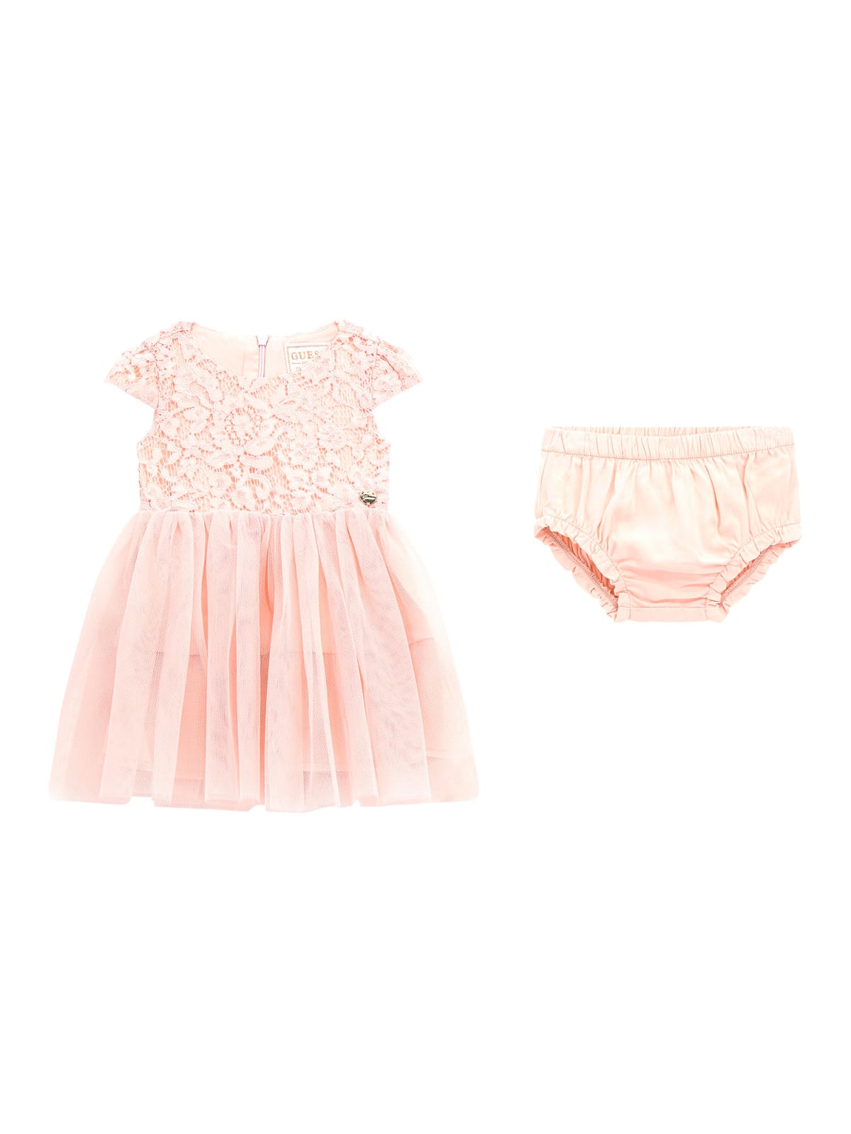 Φόρεμα κοντομάνικο με δαντέλα από την μέση και πάνω, με μεταλλική καρδιά με τύπωμα το λογότυπο αριστερά εμπρός, και με τούλι από την μέση και κάτω, με ύφασμα εσωτερικά και επιπλέον τούλι στο τελείωμα, με στρογγυλή λαιμόκοψη, κλείσιμο με φερμουάρ πίσω στην πλάτη, και με φουφούλα.
