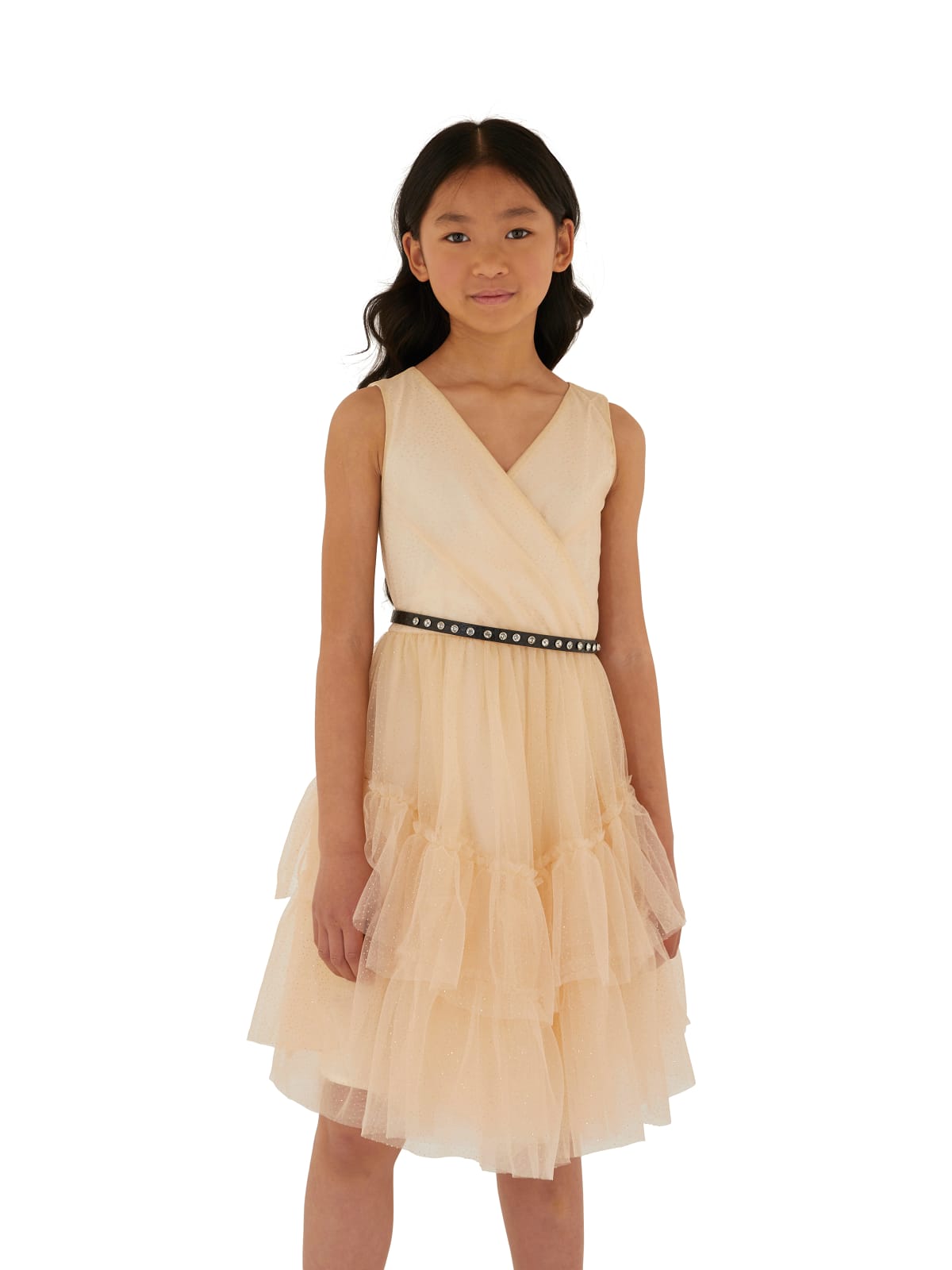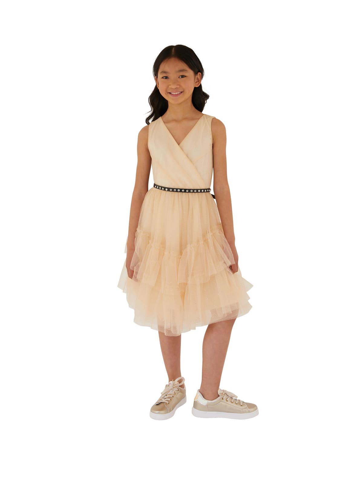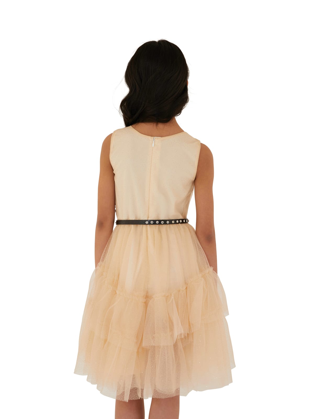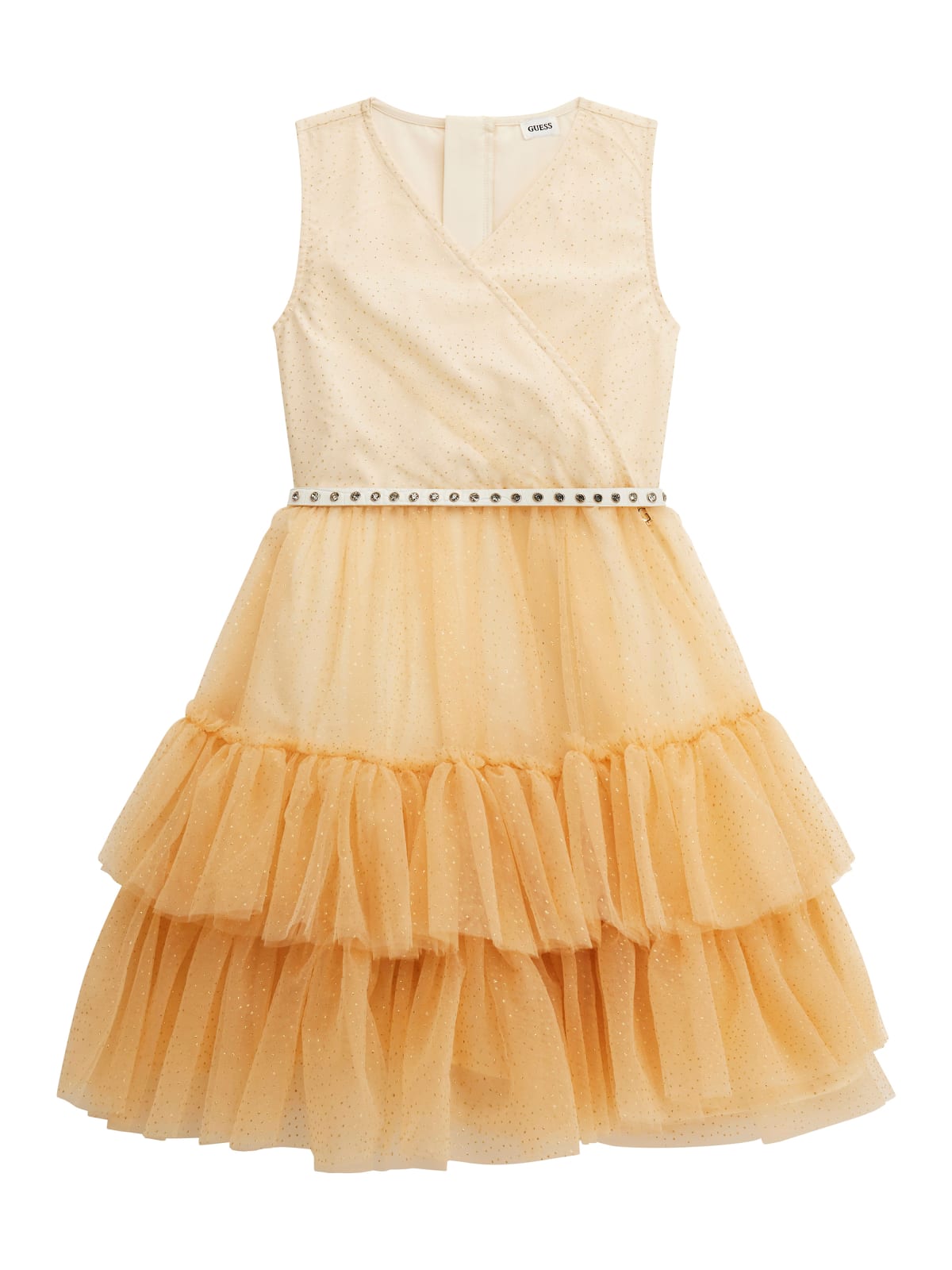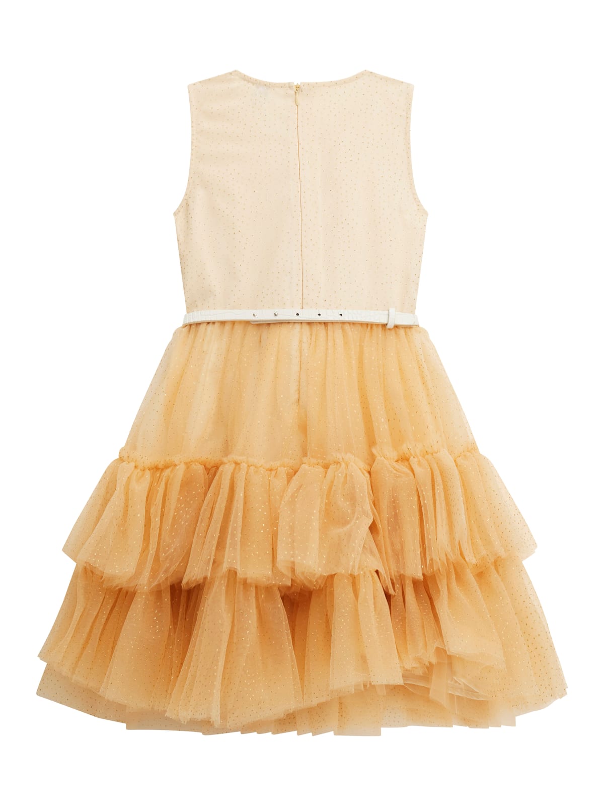 Φόρεμα αμάνικο κρουαζέ από ύφασμα εσωτερικά και τούλη με χρυσά πουά εξωτερικά σε όλη την επιφάνεια, με διπλό βολάν στο κάτω μέρος, με στρογγυλή λαιμόκοψη, κλείσιμο με φερμουάρ πίσω στην πλάτη, με μεταλλικό χρυσό το αρχικό G από το λογότυπο, στον λαιμό στην πίσω όψη, με θυλάκια με αποσπώμενη ζώνη λευκή στην μέση.